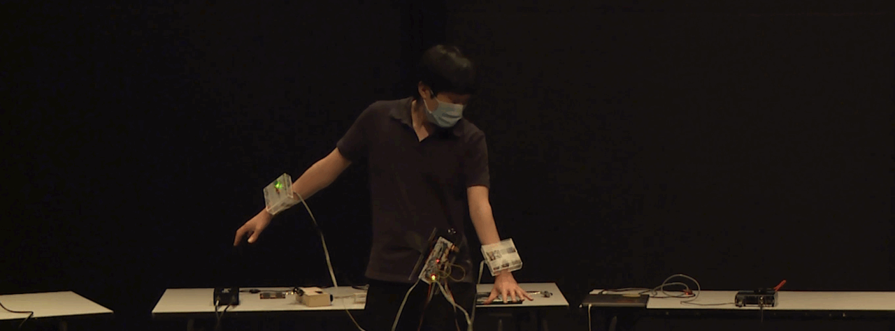 This instrument consists of several small units encased in acrylic which attach to the body, connected by long wires. Each unit attached to a limb has a 6-DoF IMU (a gyroscope and accelerometer) inside, as well as an LED which changes brightness based on other settings. The unit at the center of my body has an Arduino linked to it, as well as a Zigbee sending data to an external laptop. Each foot has pressure sensor data on the heels feeding to the computer as well. All of these feed to a MAX patch sorting the data into parameters and modulating audio output of vocal samples.